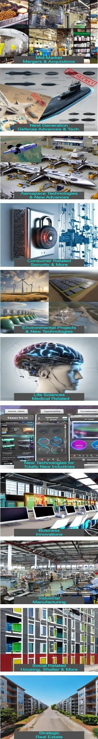 While the list of industries below is not exhaustive, it highlights our key focus areas. As opportunities emerge and new elements come into play, we remain prepared to explore them for scalable growth, including potential future IPO structures. When the timing aligns, we will communicate with our qualified investors regarding these promising opportunities. Elite privileged investors understand that participating in forward-thinking ventures before an IPO can yield significant advantages and rewards.